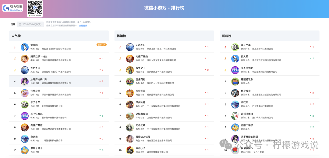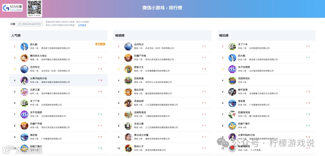 从2024年的第一个工作日的第一期榜单分析起,柠檬哥通过讲解微信小游戏畅销榜的成功案例、生动的行业洞察和有趣的个人讲解收获了来自各行各业各阶段的粉丝朋友们。