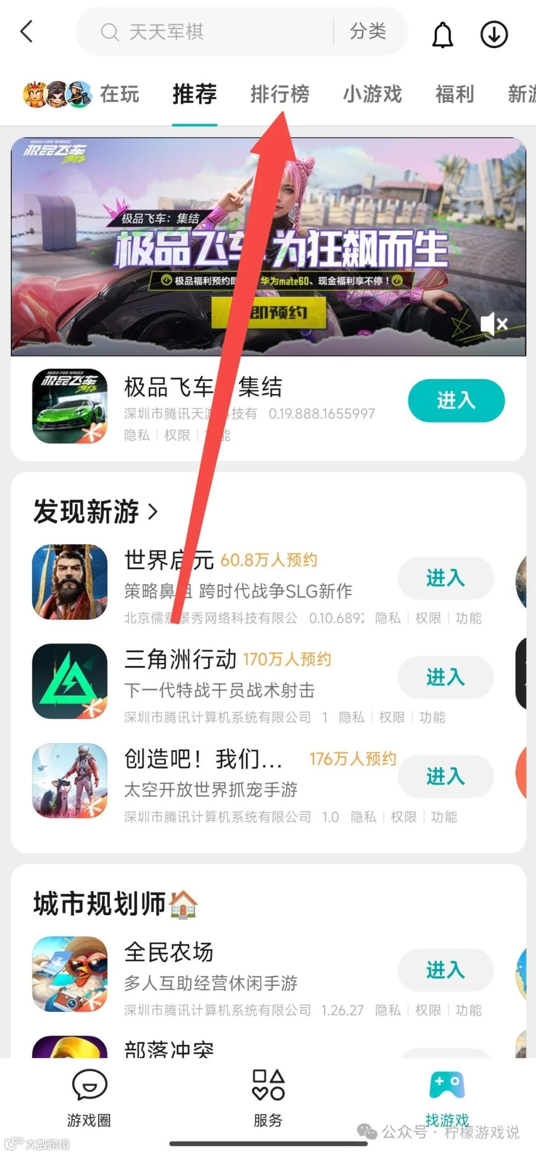 STEP 3:进入找游戏页面后,点击上方“排行榜”