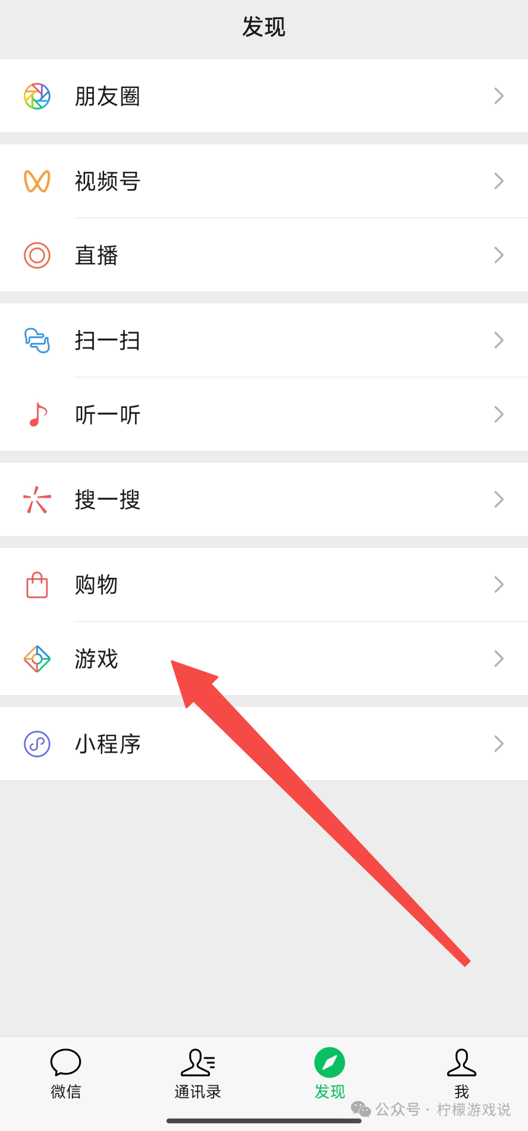 STEP 1:打开微信,点击“发现",在"发现"页面点击“游戏”