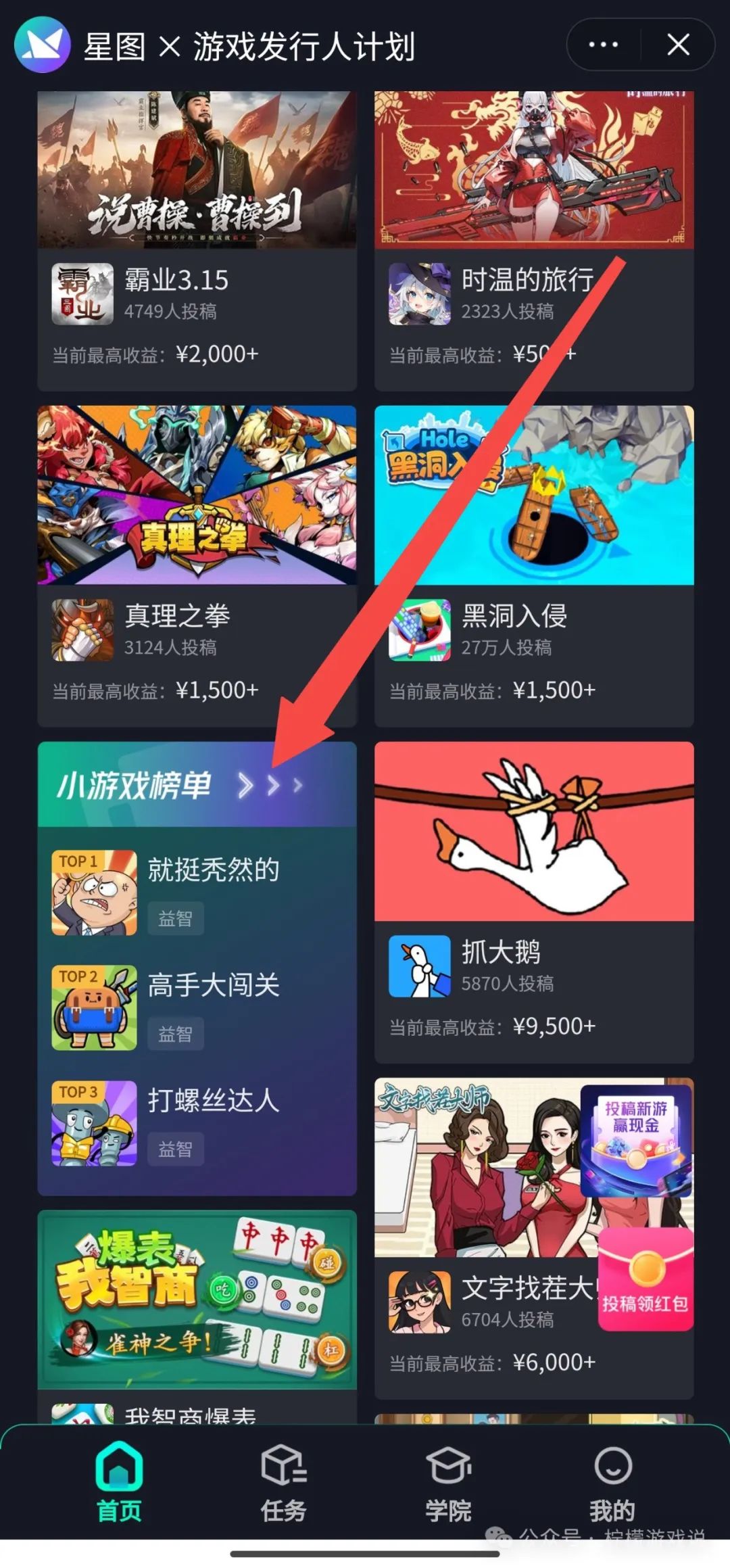 STEP 4:在"星图x发行人计划"页面下拉找到"小游戏榜单"