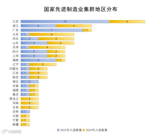 80个先进制造业集群覆盖25个省份。江苏以14个集群居首,占总数17.5%;广东、浙江并列第二,各8个;北京、河北、山东各6个,并列第三。黑龙江、河南、甘肃各新增2个,云南、宁夏、新疆各新增1个。