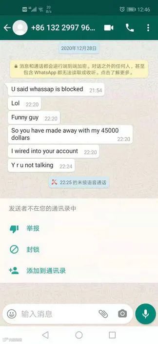我的爱人和我同行,全程的情况我也征询她的意见。她说这个钱肯定有问题。又咨询了朋友,朋友明确表示让我小心,年底了,许多老外都以帮忙代收款项给佣金的形式进行诈骗。我给朋友回复说:老外一开始提出让我帮忙付钱,我就明确表示我不挣佣金,我挣得是项目的钱。