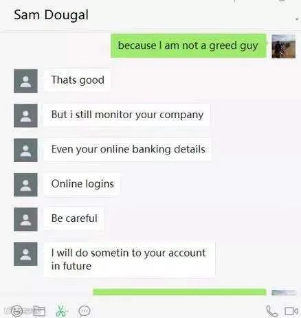 然后又利诱,竟然和我谈合作。他说我是唯一一个他没有成功的。他在迪拜,有个人教会他这样做的,能赚很多钱。说着说着,说希腊公司后边还会支付一笔钱出来,我赶紧将聊天记录截屏发给希腊公司在中国的员工以及余姚的公司,分别打电话给他们说情况,让他们提醒希腊老外,近期的付款最好先停掉,如果要支付一定要落实好收款账户信息。当时晚上10点多,我还想给希腊公司打电话告诉情况,又一想算了,一方面他们在中国的同事已经知道了情况会通知他们的,另一方面,从希腊公司的角度看,钱为什么会打到我公司的账户里,我始终也是可疑的。三言两语可以和他们的中国员工解释清楚,对老外来说,却比较费力。算了,已经退了钱,如果真的还有误解,也是我的错。