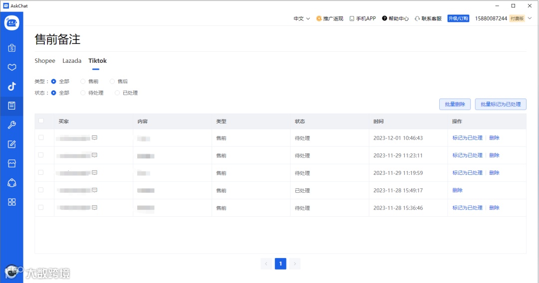 工单管理:AskChat支持TikTok Shop卖家进行售前售后工单备注,便捷化管理店铺日常接待中的待办事项。