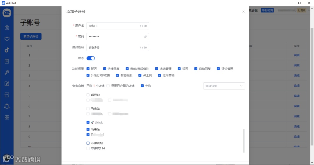 子账号设置:对于企业级的TikTok Shop卖家,AskChat支持子账号设定,不同客服设定不同权限,无需担心权限问题。