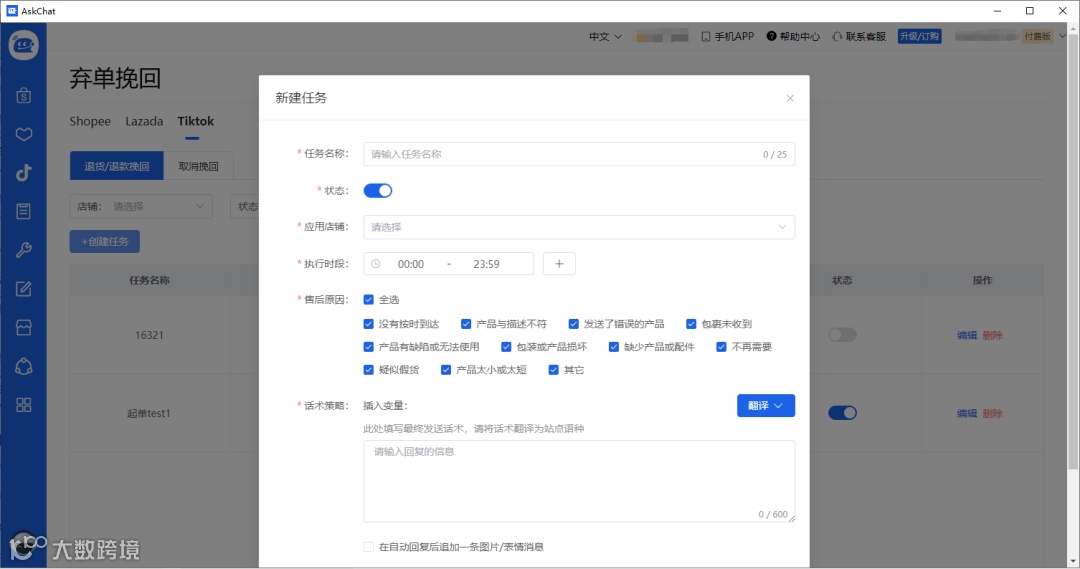 弃单挽回:有数据显示,一小时内触发挽回消息,客户完成订单的概率高达19.8%。针对TikTok Shop店铺订单的退款、退货,AskChat的弃单挽回能够根据售后原因判断,自动发送挽回消息,挽回订单,降低退货、退款率。