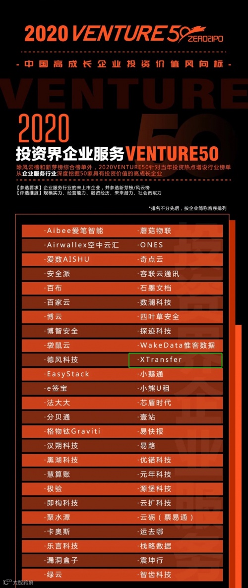 2020年12月10日,2020Venture50迎来荣耀时刻,揭晓风云榜单、新芽榜单,以及五大行业榜单。其中,凭借在跨境金融领域的领先地位和广阔的市场前景,一站式外贸企业跨境金融和风控服务企业XTransfer成功入选2020Venture50投资界企业服务榜单。