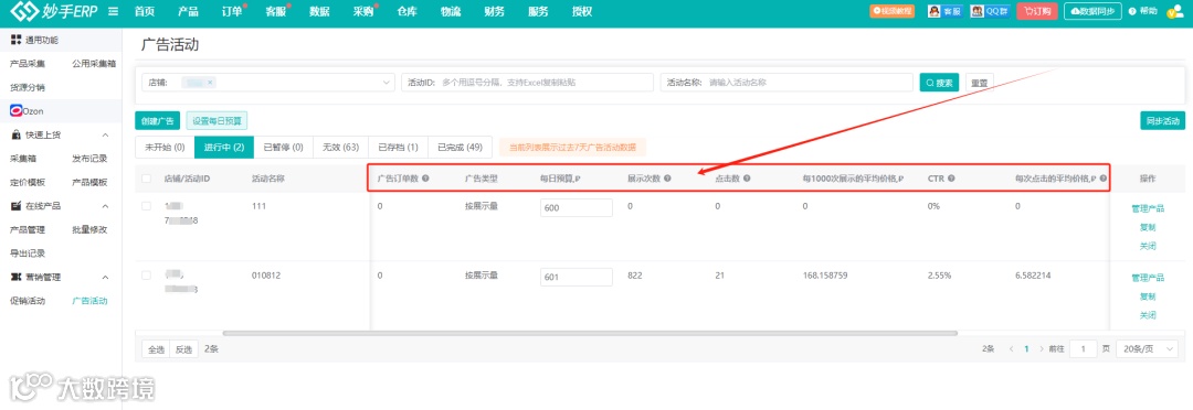 妙手ERP支持一屏展示7天内多维度的广告活动数据,包括:广告订单数、广告类型、每日预算、展示次数、点击数、广告销售订单额等指标,且系统可根据这些指标自动计算每1000次展示的平均价格、CTR(点击数与展示次数的比例)等,方便卖家清晰查看广告数据,精准分析投放效果,并及时作出优化调整,保证活动效果。