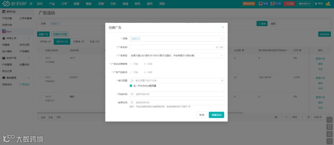 现在,妙手ERP支持创建多个广告计划,卖家朋友可以根据店铺、广告名称、广告类型、每日预算、开始/结束时间等维度,轻松创建多个广告活动,快速提升店铺商品曝光。