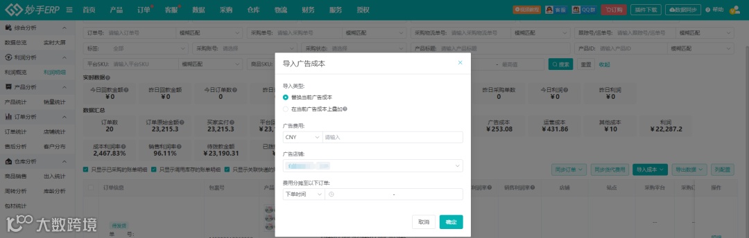 很多卖家朋友都会在促销、节日等节点设置店铺广告投放,如果这部分的费用没有计算到成本中,则会导致店铺支出与实际利润对应不上。