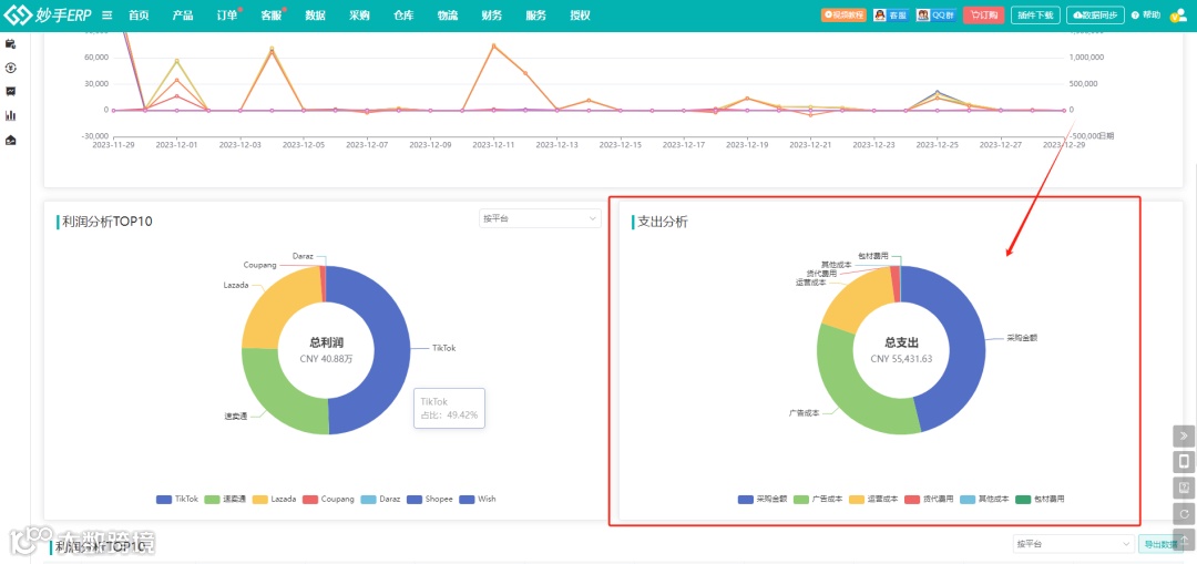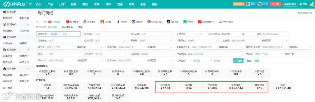 为了方便卖家朋友了解成本支出情况,掌握店铺运营状况,妙手ERP多维度展现成本费用支出详情。