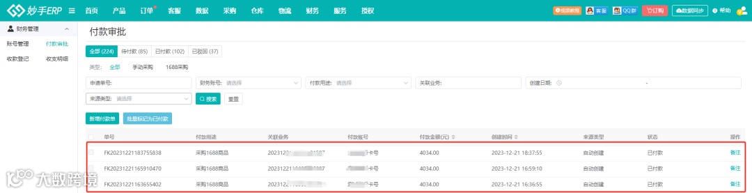 妙手ERP基于企业标准化管理,规范采购付款流程。当采购人员在【1688采购建议】-采购单页面申请下单时,系统会提交采购审核,并支持将订单情况同步至【财务模块】-【付款审批】中,再由财务人员付款后,进行1688平台采购下单,成功杜绝超付风险,提高对账效率,减少跨部门沟通成本。