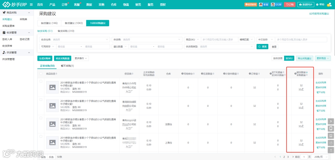 在货源采购时,卖家如果没有制定合理的采购计划,只是按照销售量进行采购,容易存在:旺季时库存不足,淡季时库存堆积的情况,从而造成一些不必要的损失。为此,妙手ERP新增1688采购建议模块,系统根据:采购、销售以及库存状况,自动生成一个建议采购数量。大家可根据这个采购数量以及具体情况进行采购,在一定程度上避免因采购不当造成的损失。