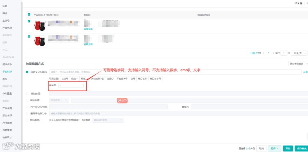 - 自定义平台SKU时,连接符支持为空或可输入其他符号(不支持输入数字、emoji、文字)