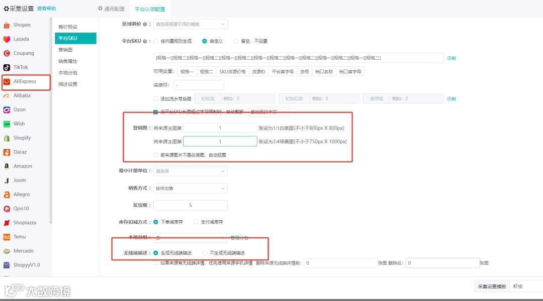 - 采集设置默认从第一张来源主图作为营销图和白底图,默认勾选生成无线端描述(已设置过的商家不做调整)