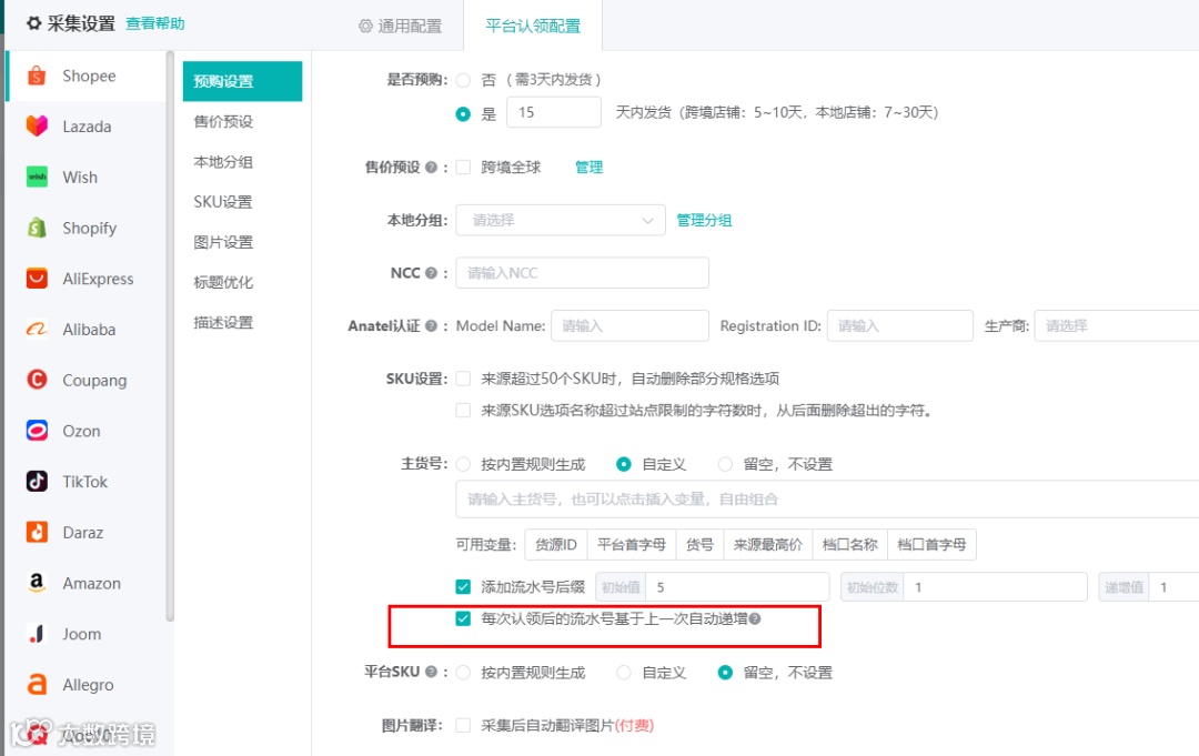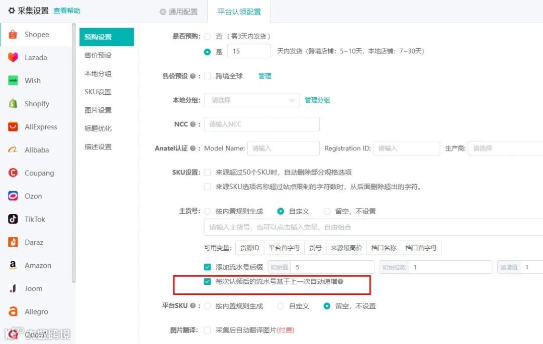 - 认领配置中的主货号(父SKU)支持按后缀自动递增