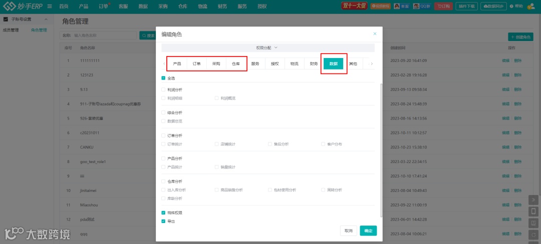 - 子账号角色管理下的产品、订单、采购、仓库、数据板块增加“导出”权限