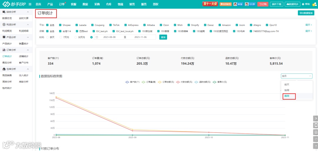 - 订单统计中的数据指标趋势横轴支持切换成按月显示
