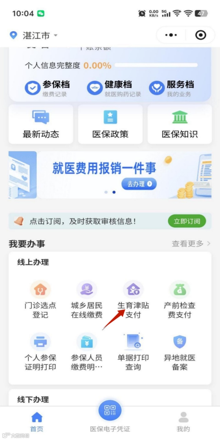 登录粤医保小程序——找到“费用报销”模块——点击“生育津贴支付”功能。