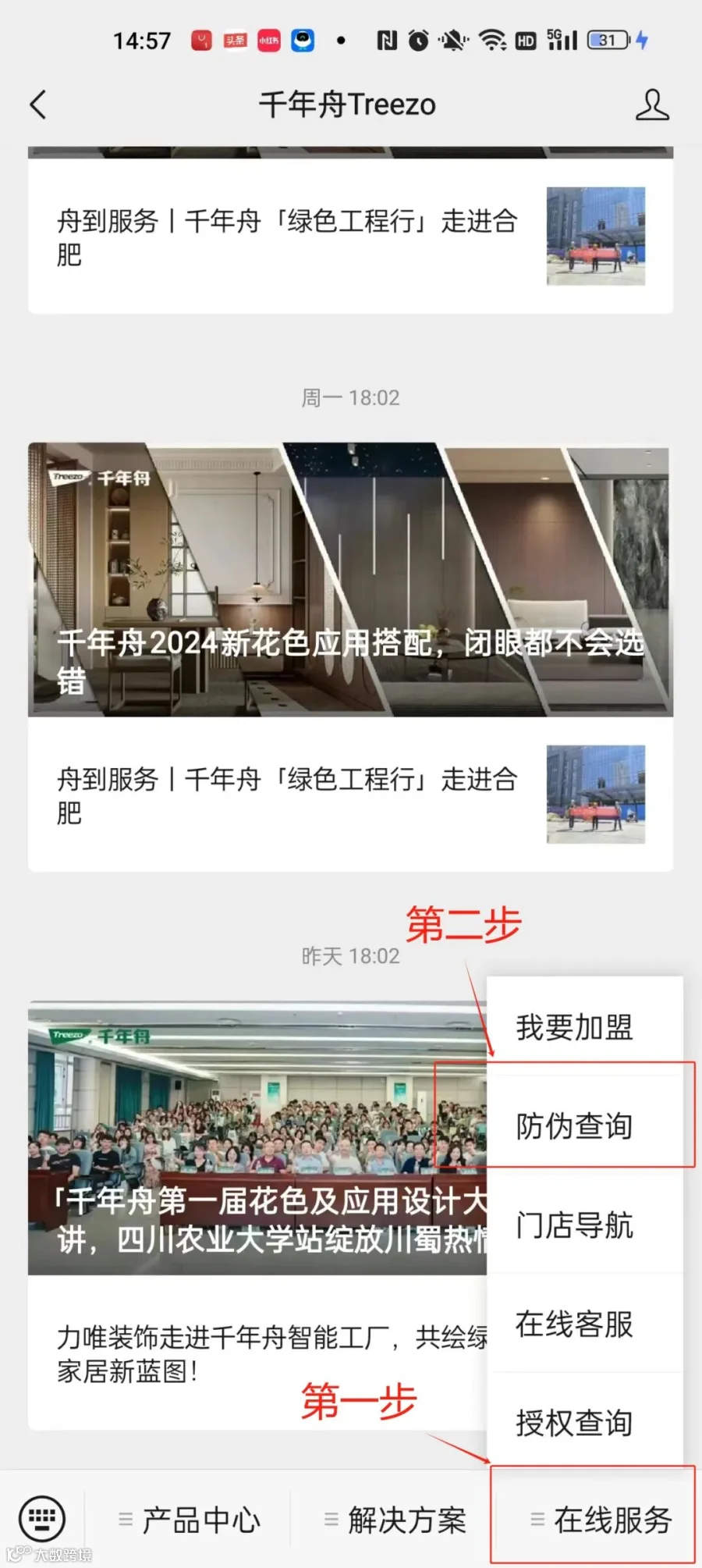 ●关注千年舟Treezo微信公众号,在手机下方菜单栏选择“在线服务”→ “防伪查询”;