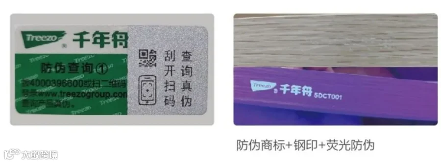千年舟体系内所有饰面纸,均可使用紫外灯照射防伪标。根据其品类差异呈现不同的专用防伪图案,防伪工艺分为印刷防伪和浸胶防伪。