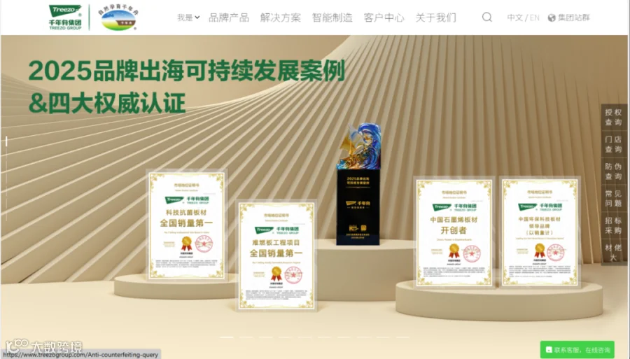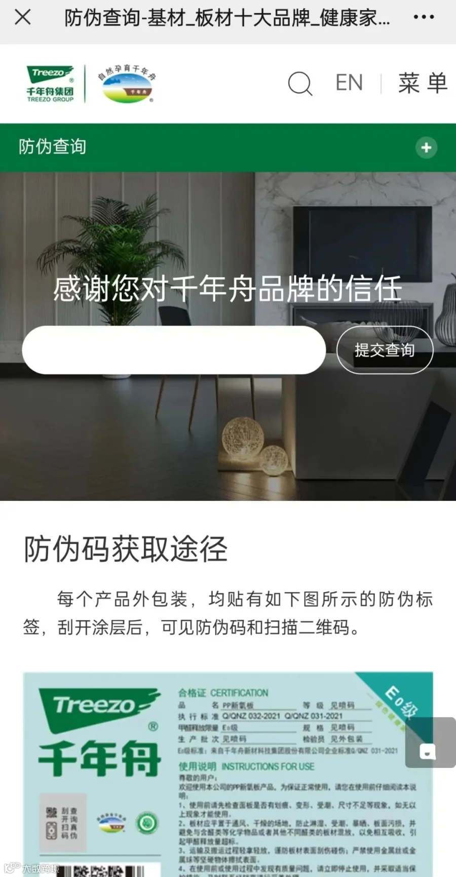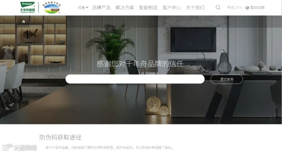 ●电脑登录官网www.treezogroup.com,选择右侧“防伪查询”,进入防伪码查询页面,输入防伪码进行真伪查询。