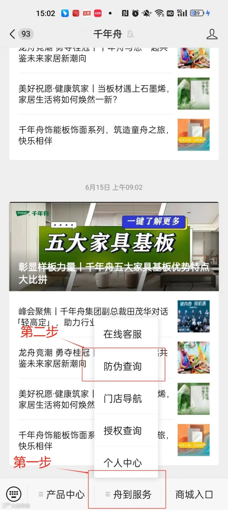 ●关注千年舟微信公众号,在手机下方菜单栏选择“舟到服务”→ “防伪查询”。
