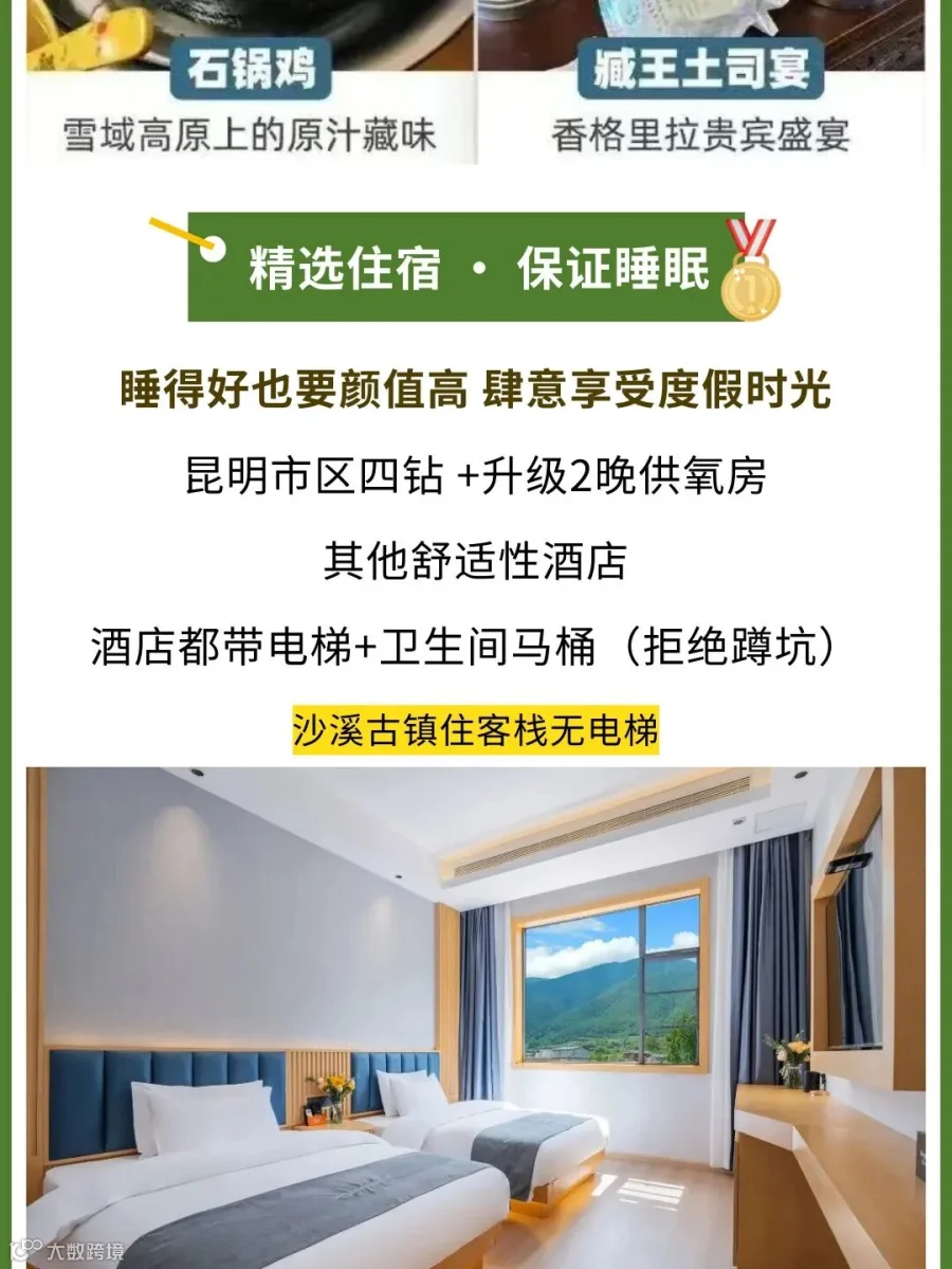 3:住宿:昆明升级4钻酒店+2晚供氧酒店其余舒适性酒店