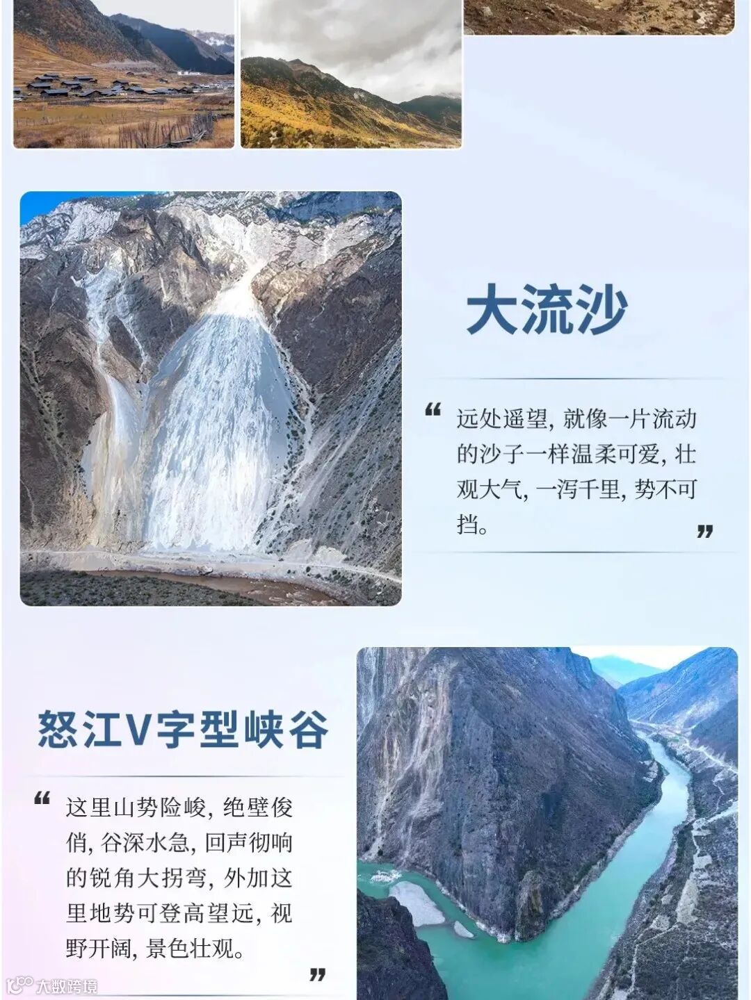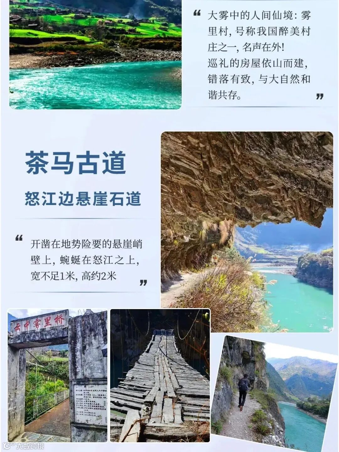 早餐后乘车沿新滇藏通道【美丽公路】一路前行;打卡【小沙坝服务区】计划时间20分钟 参观体验沐浴天堂怒江傈僳登埂温泉【澡塘会】怒江澡塘会是怒江地区的傈僳族一个独具民族特色的传统盛会,男女不忌,共浴一池,这是僳僳族延续了百年的传统习俗。沿途观赏【维拉坝伟人峰】【老虎跳】【金满银滩】参观匹河【飞来石】。随后游览著名的法国传教士建造的基督教堂【老姆登】老姆登”是怒族语的音译,意思是“人喜欢来的地方”。参观【知子罗】和碧江“废城”八角楼。在这里可左观【碧罗雪山】峰峦起伏,右看是【高黎贡山】皑皑白雪,脚下千米怒江喧腾咆哮,三百里怒江峡谷峡谷尽收眼底。随后乘车途径【福贡】享用午餐,。拍摄高黎贡山山脉中峡谷中(利沙底乡)的地质奇观【石月亮】可自愿自费(50元)体验怒江【溜索】参观【远征军回国渡口】计划时间20分钟
