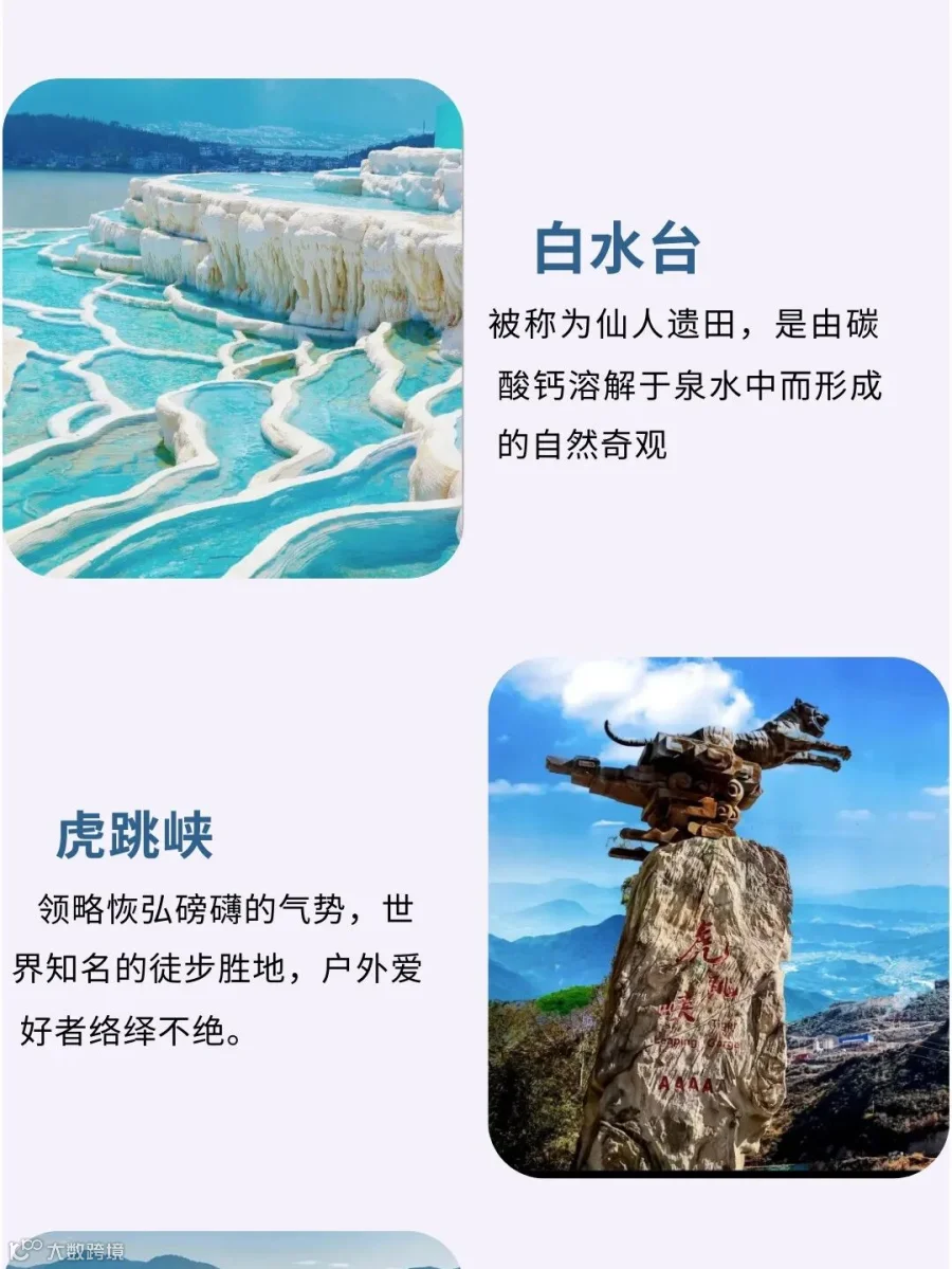 早餐后乘车沿【香白旅游观光线】,经【洗脸盆】观景台间歇拍照,随后前往【白水台】(计划时间2小时)风景区,白水台位于哈巴雪山麓,它是由于碳酸钙溶解于泉水中而形成的自然奇观。远处看去,青山掩映中的白水台造型真的就像层层梯田,被称为“仙人遗田”,在阳光照耀下,又仿若摄影作品中凝固的瀑布一般。