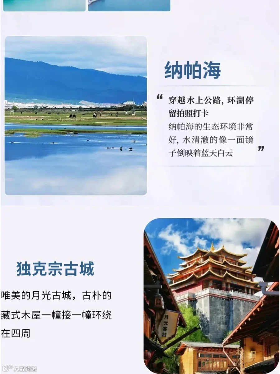 早餐后拍摄【梅里雪山日照金山】计划时间1小时梅里雪山又叫太子雪山,有十三峰称太子十三峰。观景台上的白塔与雪山遥遥呼应。万丈金光从天而降照射在雪山之巅,越过阻碍突然照射在雪山顶上,然后逐渐扩大,形成绝美的“日照金山”的自然奇观,是世界上最美的雪山之一,常年云雾缭绕,白茫雪山山顶积雪终年不化,就像一座晶莹透亮的玉柱直插蓝天,巍峨壮丽。之后乘车前往【香格里拉】途径【德钦】【白马雪山】【奔子栏】【纳帕海/伊拉草原】观景台停车拍照。到达香格里拉午餐后游览【独克宗古城】计划时间1.5小时 独克宗”藏语意为白色石头城,寓意月光城。位于【月光广场的龟山公园】一座全球最大的转经筒,大家可以合力转动转经筒为家人祈福,登顶可以看到整个县城的全貌。是中国保存极其完美而庞大的藏民居群,也是茶马古道的重要枢纽。