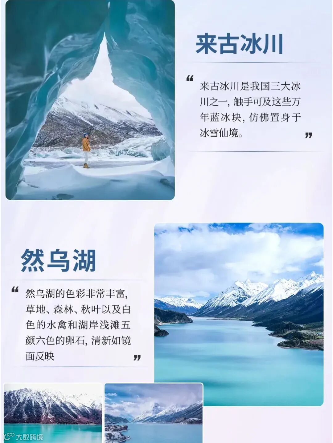 随后返回波密享用午餐后前往【米堆冰川】不含电瓶车36元 计划时间2小时 米堆冰川是西藏最重要的海洋性冰川,也是世界上海拔最低的冰川。冰川下端是针阔叶混交林地,皑皑白雪终年不化,郁郁森林四季常青,头裹银帕,下着翠裙。以发育美丽的拱弧构造闻名,是罕见的自然奇观。之后经【然乌隧道】穿行【安久拉山】抵达【八宿】晚餐后入住酒店。