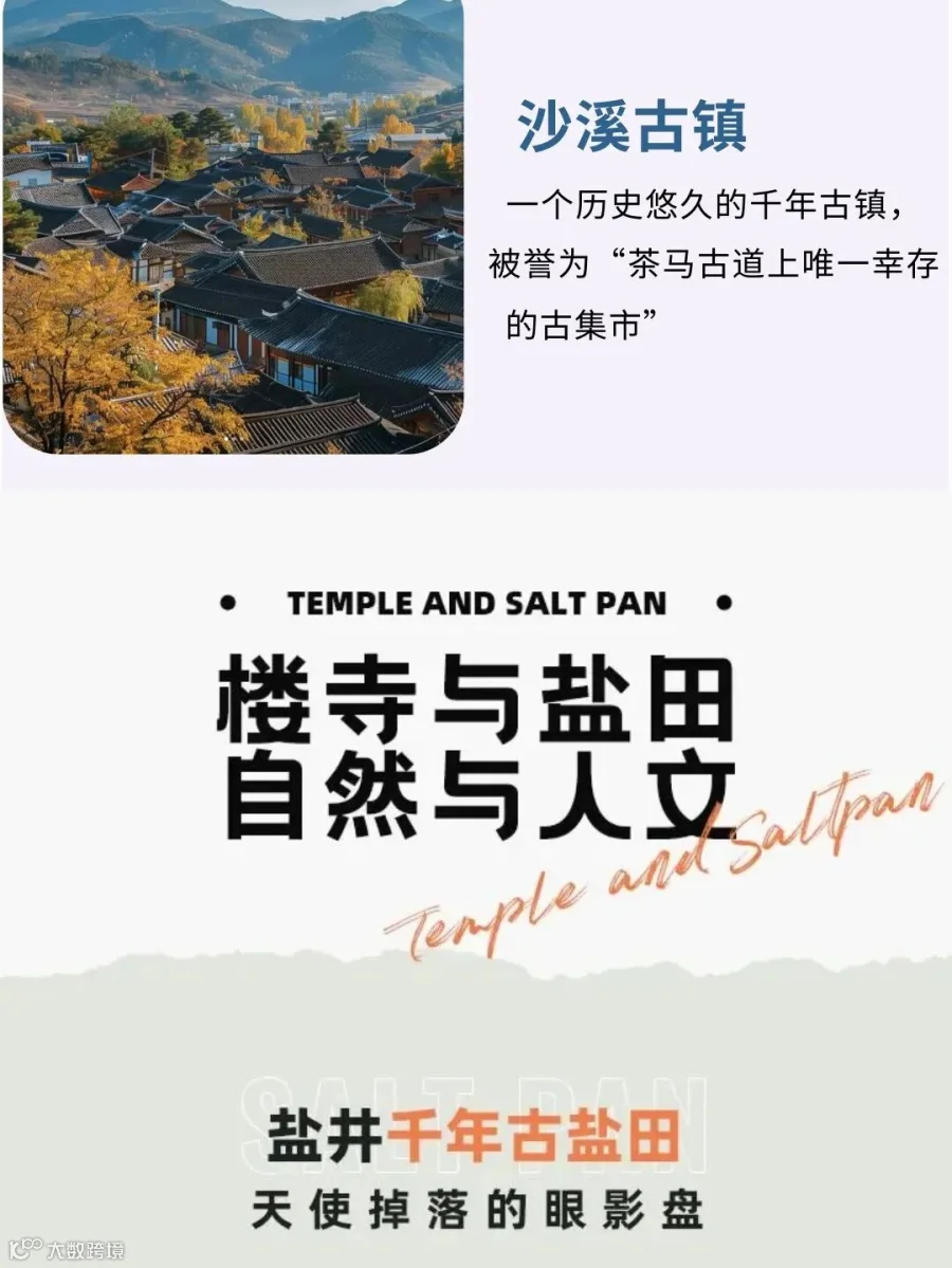 早餐后游览电视剧“去有风的地方”【沙溪古镇】计划时间2小时 这里曾是茶马古道上的一个古镇,古寺庙,古戏台,古商铺,马店,古老的红砂石板街道,百年古树、古巷道、古寨门。上可追溯到2400多年前的春秋战国时期,至今仍然保持着最原始的建筑特色。唐宋时期,沙溪作为南诏、大理国当时古道上的一个古镇,发挥着积极的作用。