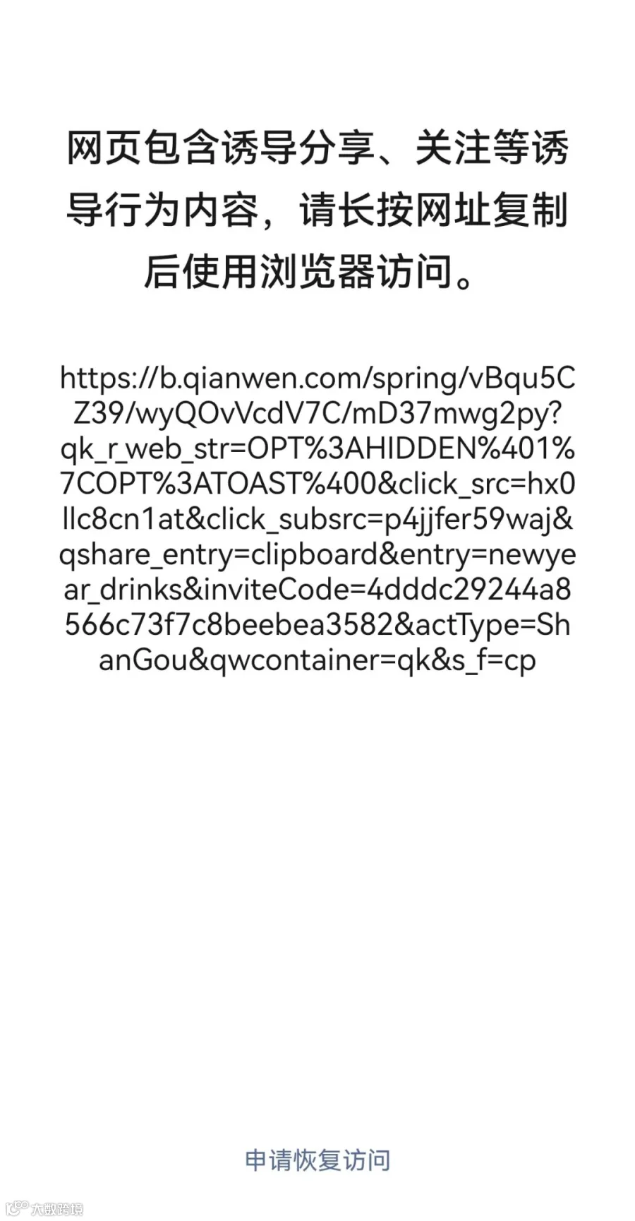 然而,继微信封杀自家腾讯元宝、百度文心助手后,千问的红包分享链接也被微信屏蔽,页面显示网页存在诱导或误导下载/跳转的内容,需要跳转第三方浏览器访问。同时,部分用户在千问APP点击分享活动至微信好友时,已自动改为复制口令形式。