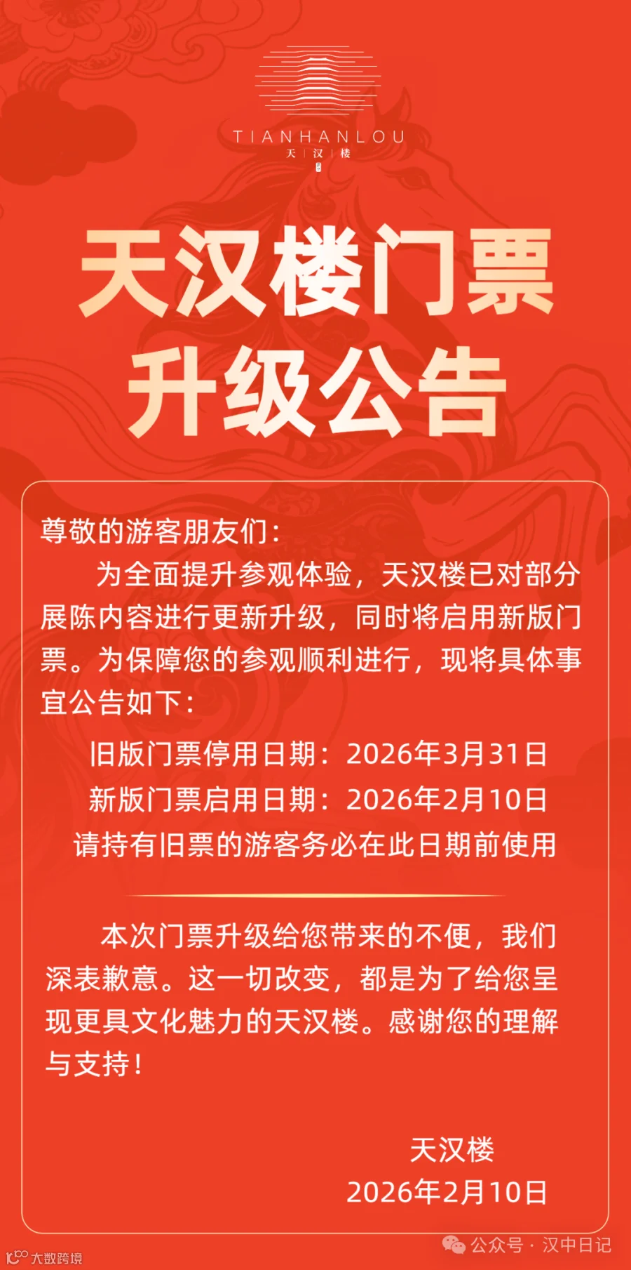 汉中天汉楼门票升级公告