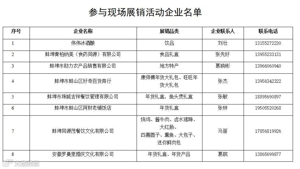 (一)现场展销活动。活动期间,在淮河文化广场设立年货商品、土特产品、特色美食等展销区。(90家展销企业名单详见附件)