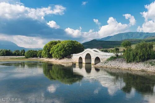 它在玉龙雪山脚下,夏天的水是碧绿的,冬天又是深蓝色,玉龙雪山倒影在湖里,中间的那座拱桥搭配两边的柳树感觉超美。远离熙攘的古城,没有热闹的旅行团,只有白云,雪山,倒影,心情美美哒。