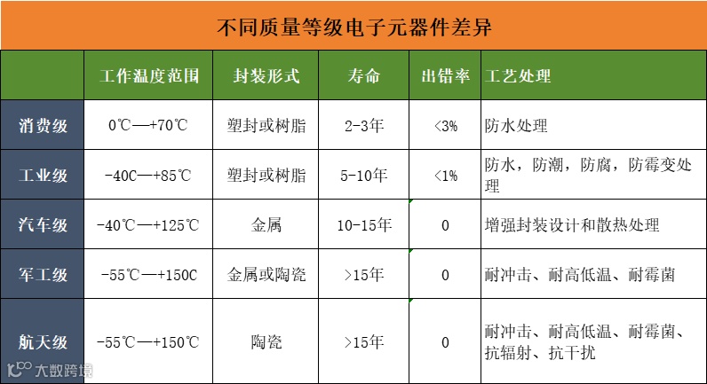 电子元器件根据使用环境与可靠性要求,通常分为消费级、工业级、汽车级、军工级和航天级。不同等级的器件在温度范围、寿命、抗干扰能力及制造标准等方面存在显著差异。