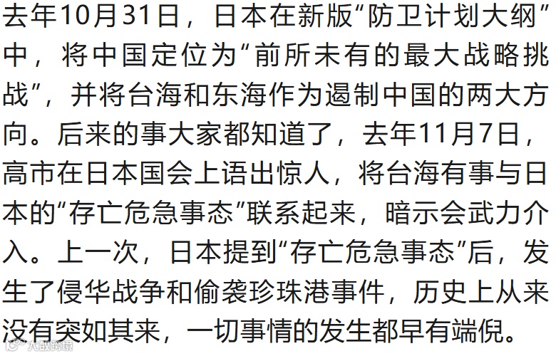 从高市早苗上台以后,日本在对华路线、台海问题、美日关系等方面几乎明牌。在对华关系上,2025年10月,高市就任首相后在日本国会发表演讲,渲染“中国军事威胁”,宣称要强化美日同盟来对抗中国。随后,高市内阁开会决定增加防卫预算,突破“专守防卫”的原则,也就是所谓的“先发制人”。这里已经显露出突破日本“和平宪法”的迹象,充满了日本军国主义色彩。