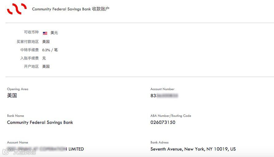美国的开户行是纽约的Community Federal Savings Bank(CFSB):