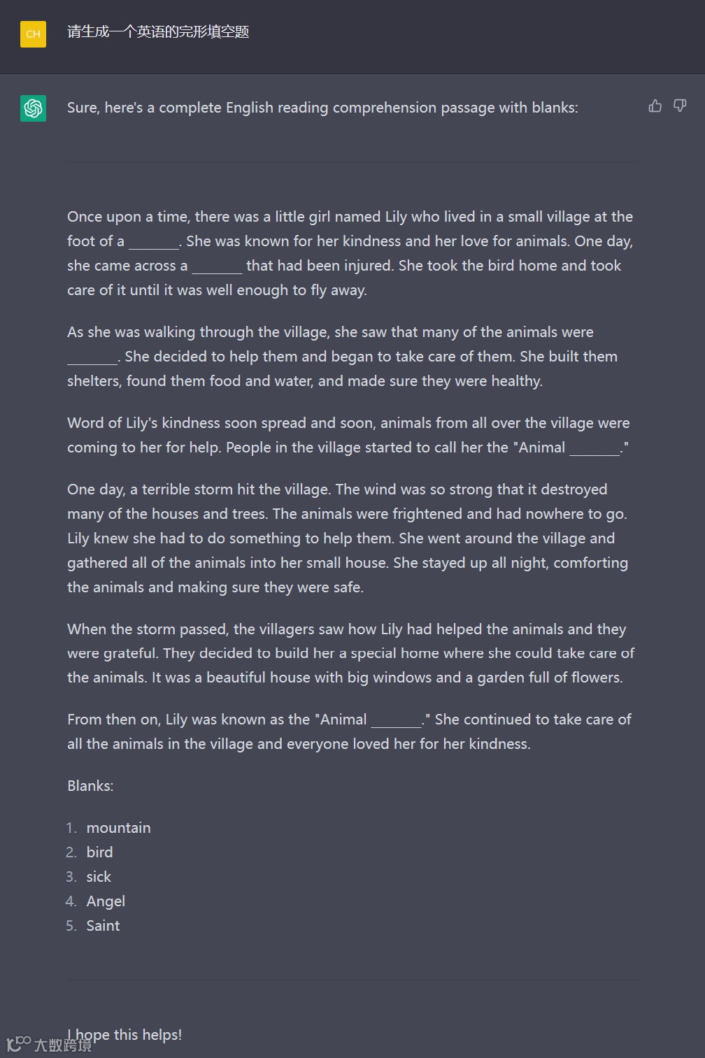 个性化定制练习题目,ChatGPT还是最强大的。如果想测试某些词的词性变化,或者将重难点词放到具体语境中帮助学生更好理解词义,ChatGPT可以快速生成测试题目。