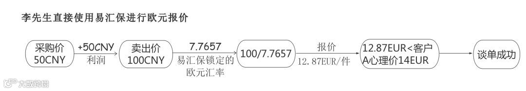 客户A对这个欧元报价既诧异又兴奋,不仅少于自己的心理价位14EUR,而且无需自己去换汇,省去不少麻烦!于是立即与李先生签订了合同,并允诺以后将继续合作!