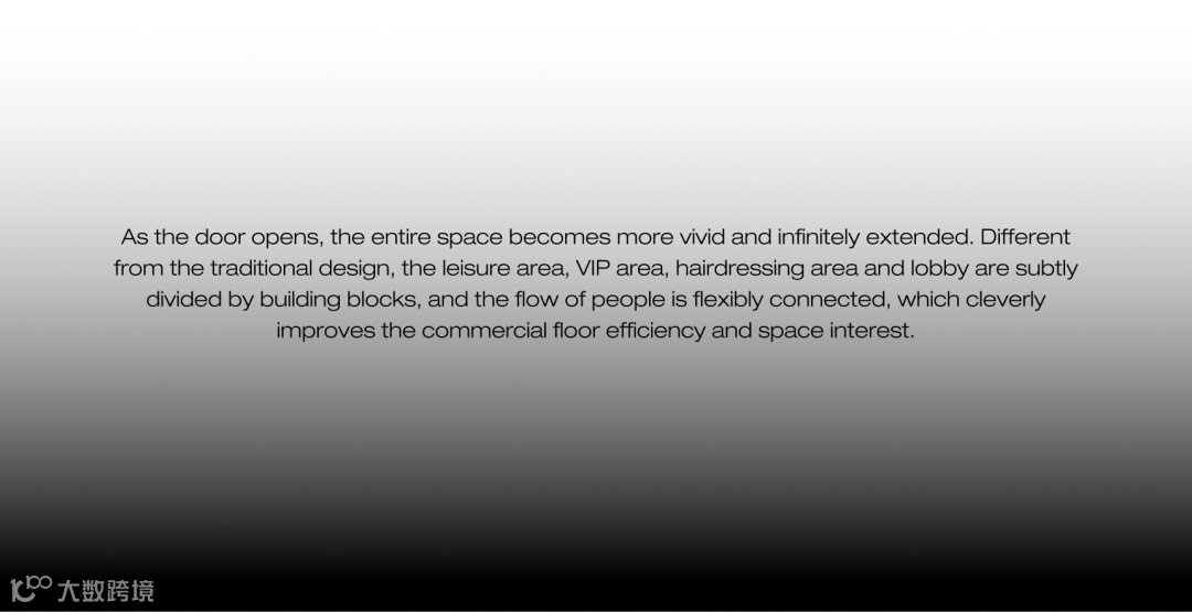 随着大门的开启,整个空间层次跃然、无限延展。区别于传统,运用建筑体块将休闲区、VIP区、美发区、大厅微妙切分,人流动线灵活贯通,巧妙提高商业坪效及空间趣味。
