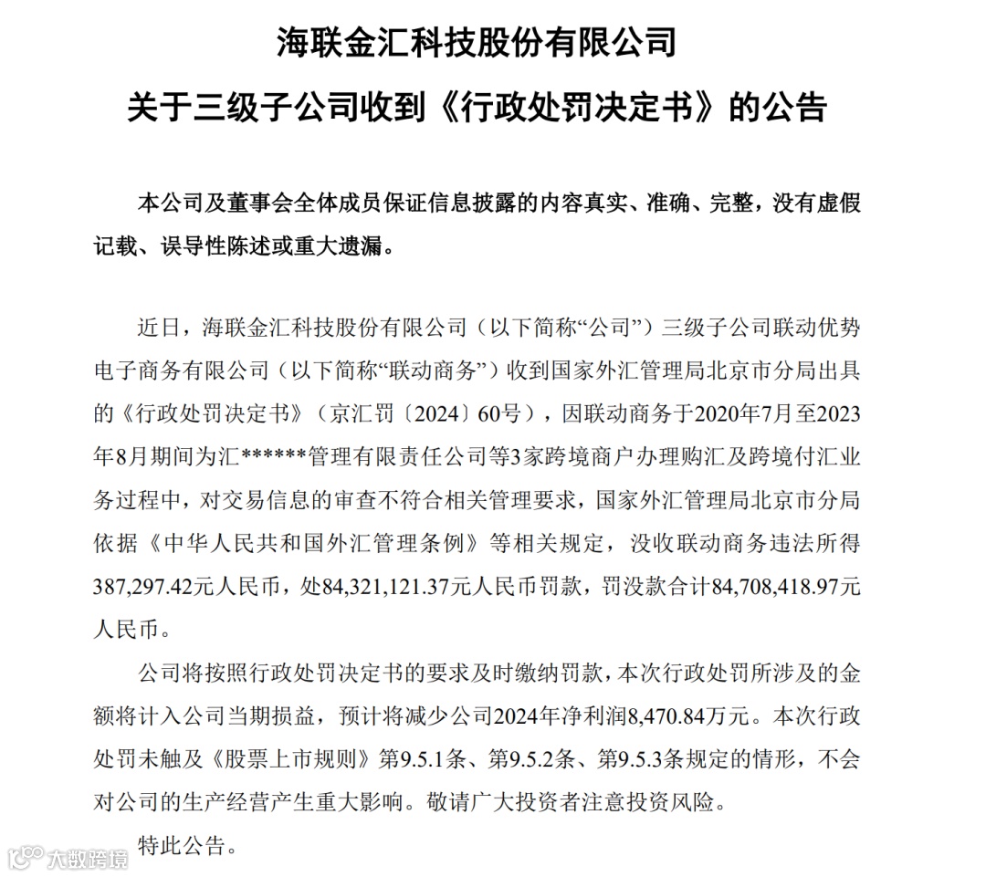 联动优势被外汇局罚没8470万,因3家跨境商户交易违规