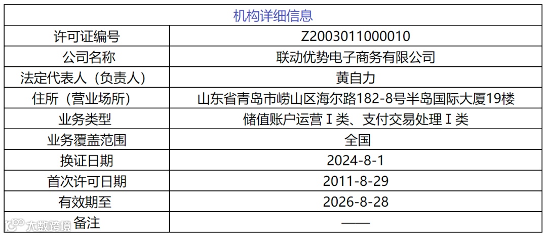 据移动支付网了解,联动优势成立于2003年,2011年获得支付牌照,业务类型为互联网支付和移动电话支付,2014年新增银行卡收单。即储值账户I类,支付交易处理I类。