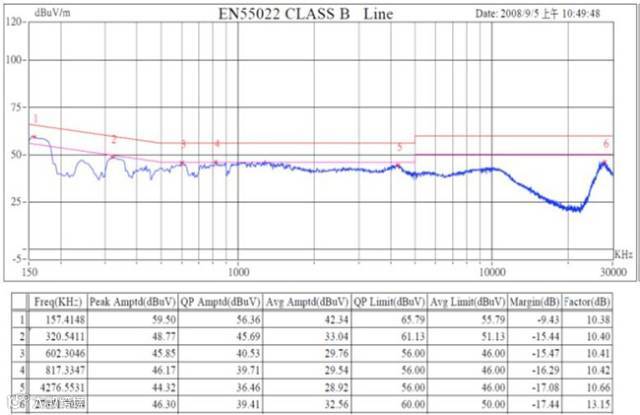 图2展示典型测试结果:蓝色曲线为峰值扫描结果,用于快速识别干扰频点。后续针对前6个高点进行准峰值(QP)和平均值(AV)精确测量。因QP与AV反映信号重复率与平均能量,其读数必然低于峰值。若峰值已有足够余量,可省去单点QP/AV测试。