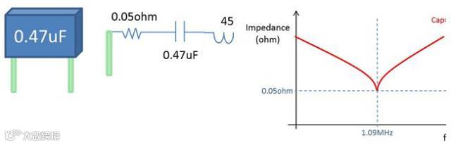 真实元件存在寄生参数。电容有等效串联电感(ESL)和电阻(ESR),在自谐振频率后阻抗上升,表现为电感性。