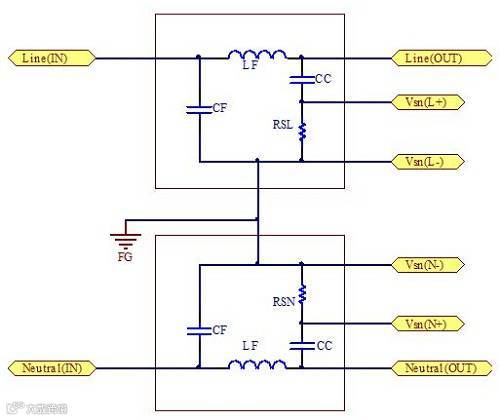 图4为LISN内部结构。LF与CF滤除电网低频噪声,CC与RSL/RSN提取高频干扰信号Vsn,供接收机或频谱仪分析。