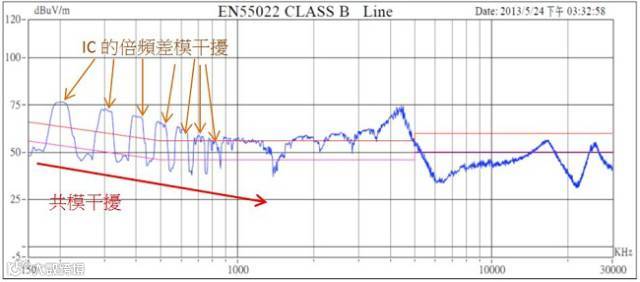 图7显示未加对策时的传导结果,前端呈现等间隔(100kHz)的差模干扰峰,对应IC开关频率及其倍频。共模背景呈线性衰减,差模信号叠加其上。