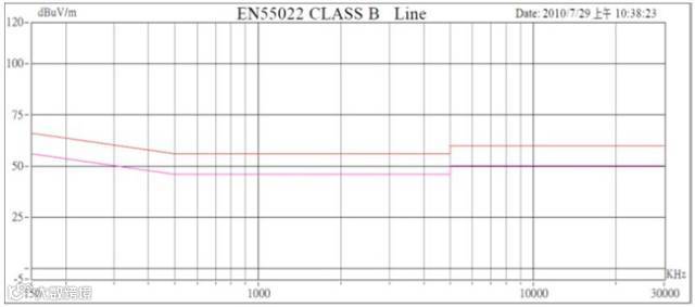 图1为EN-55022 CLASS B限值曲线,红色线为准峰值(QP)限值,粉红色线为平均值(AV)限值。测试目标是确保所有频率点的测量值均低于限值线。